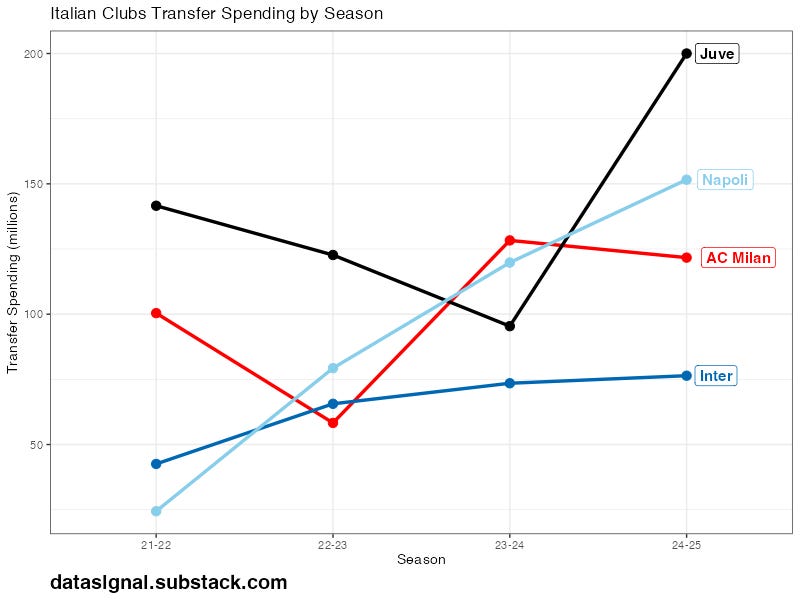 Juventus saw a dramatic surge last year (perhaps backing new manager Thiago Motta?). Napoli have increased their spending over the years, while Milan's spending pattern shows volatility.